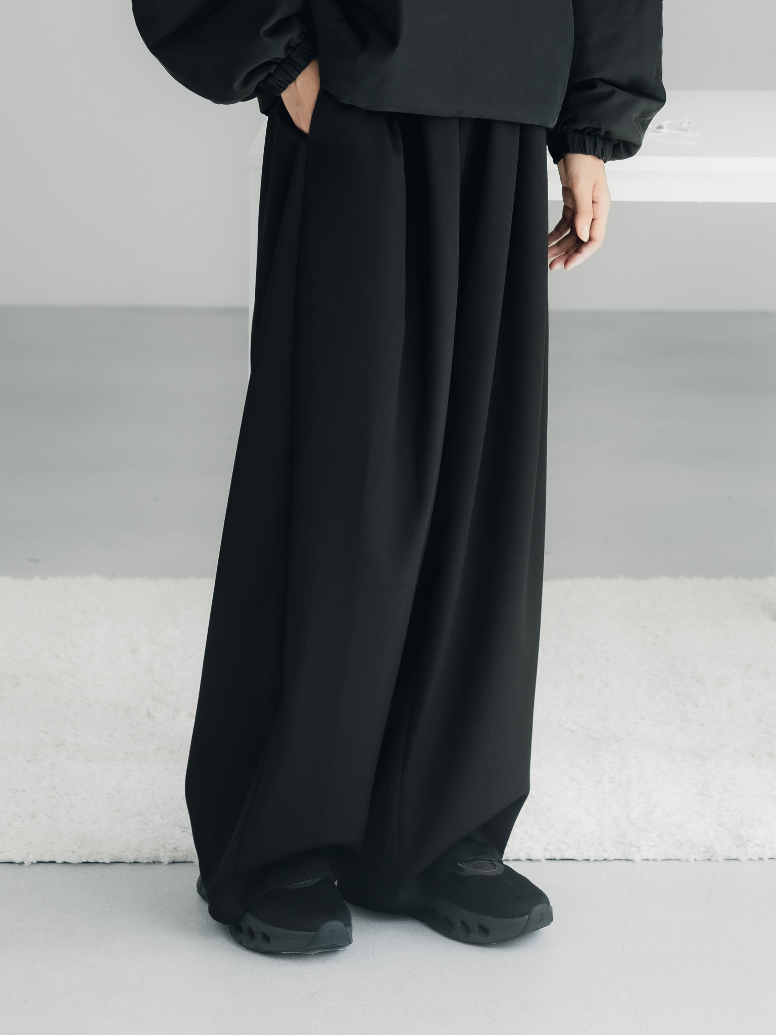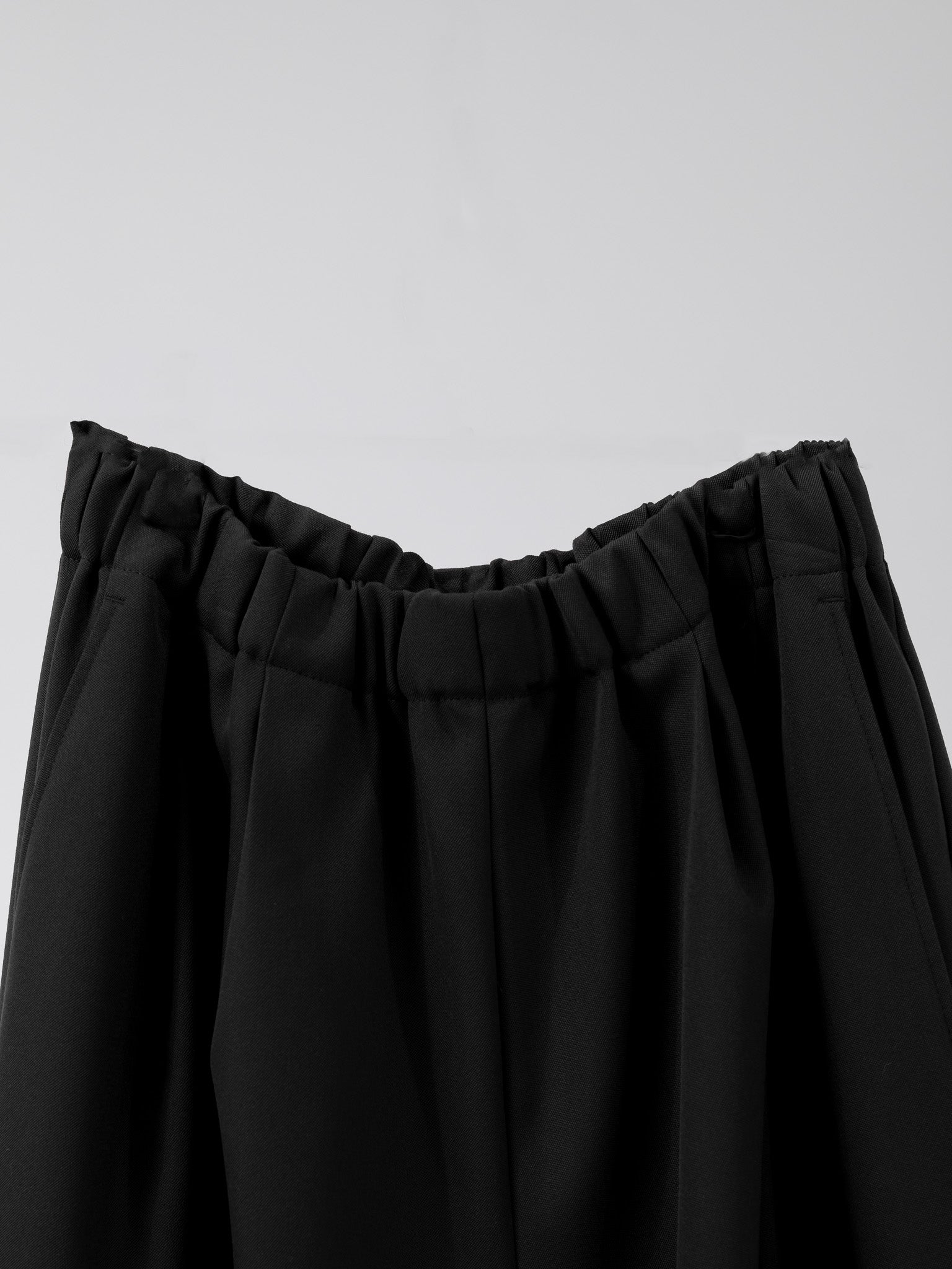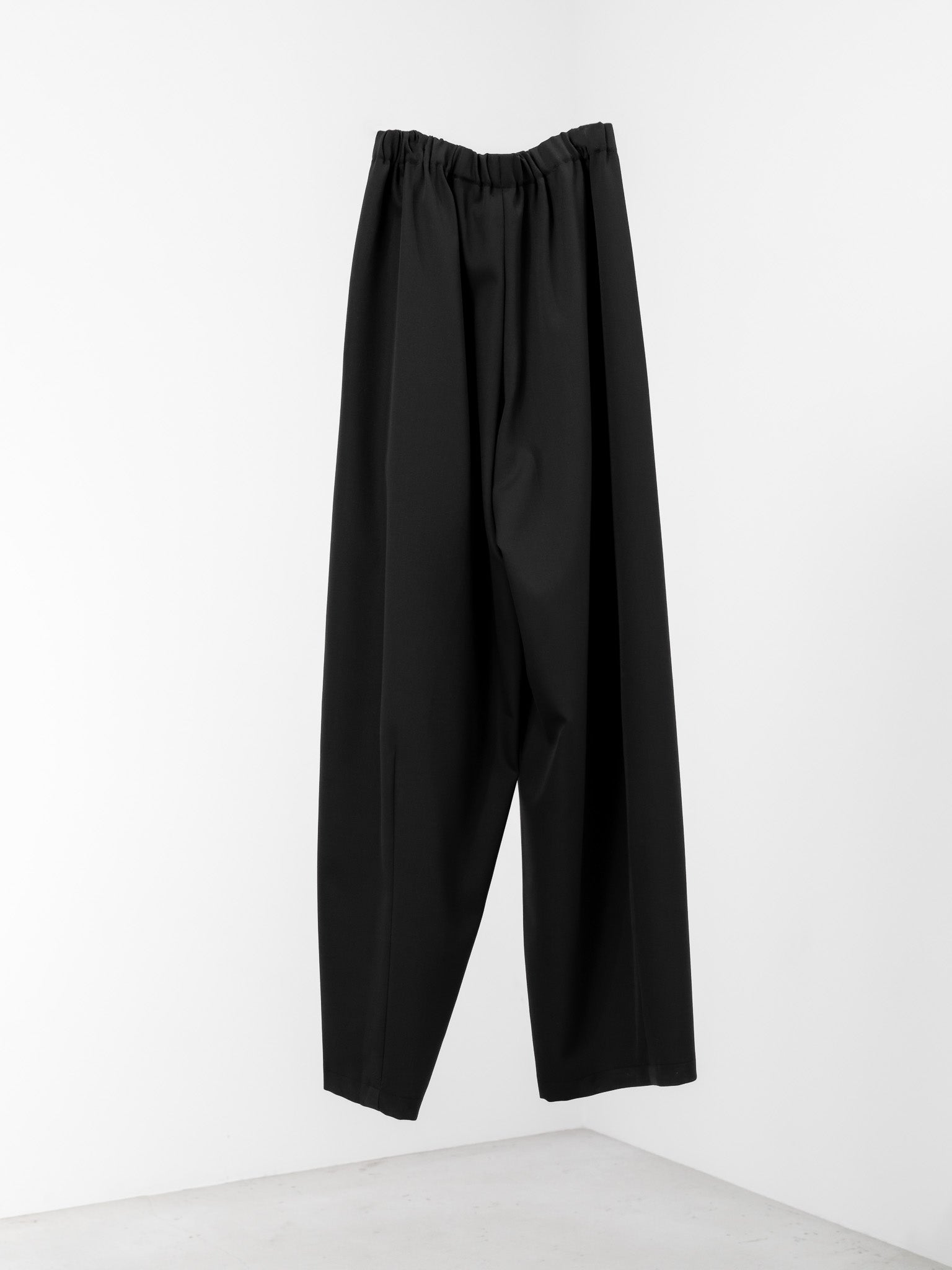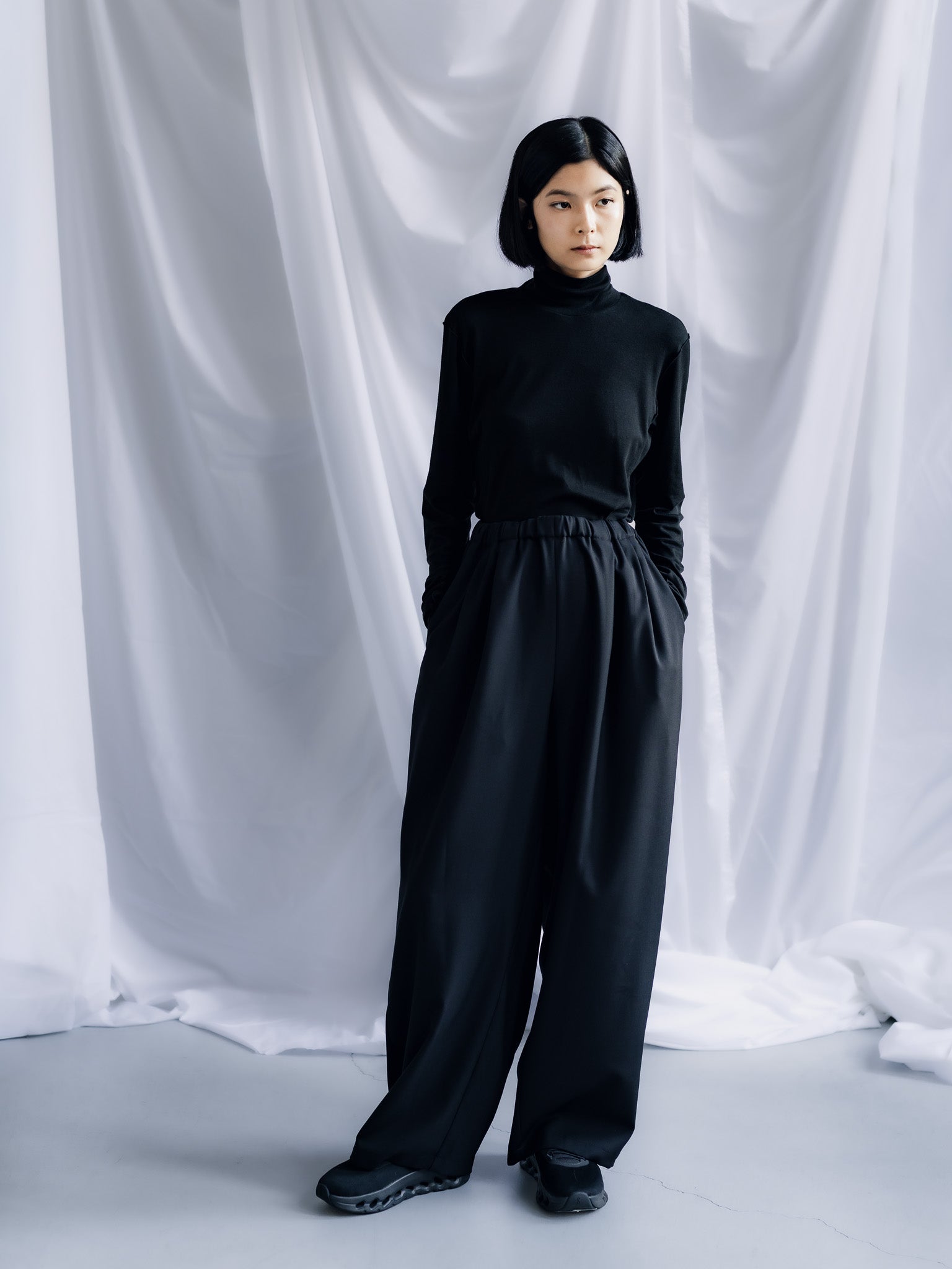 パターンはバレルパンツのような丸みを意識していますが、落ち感のあるウール混素材を使用することで過剰なボリュームを抑え、自然なドレープと縦のラインを強調。