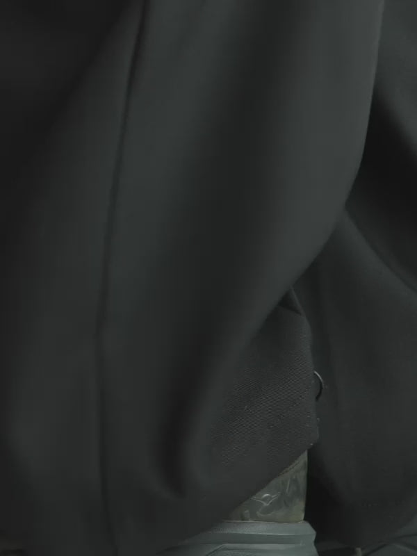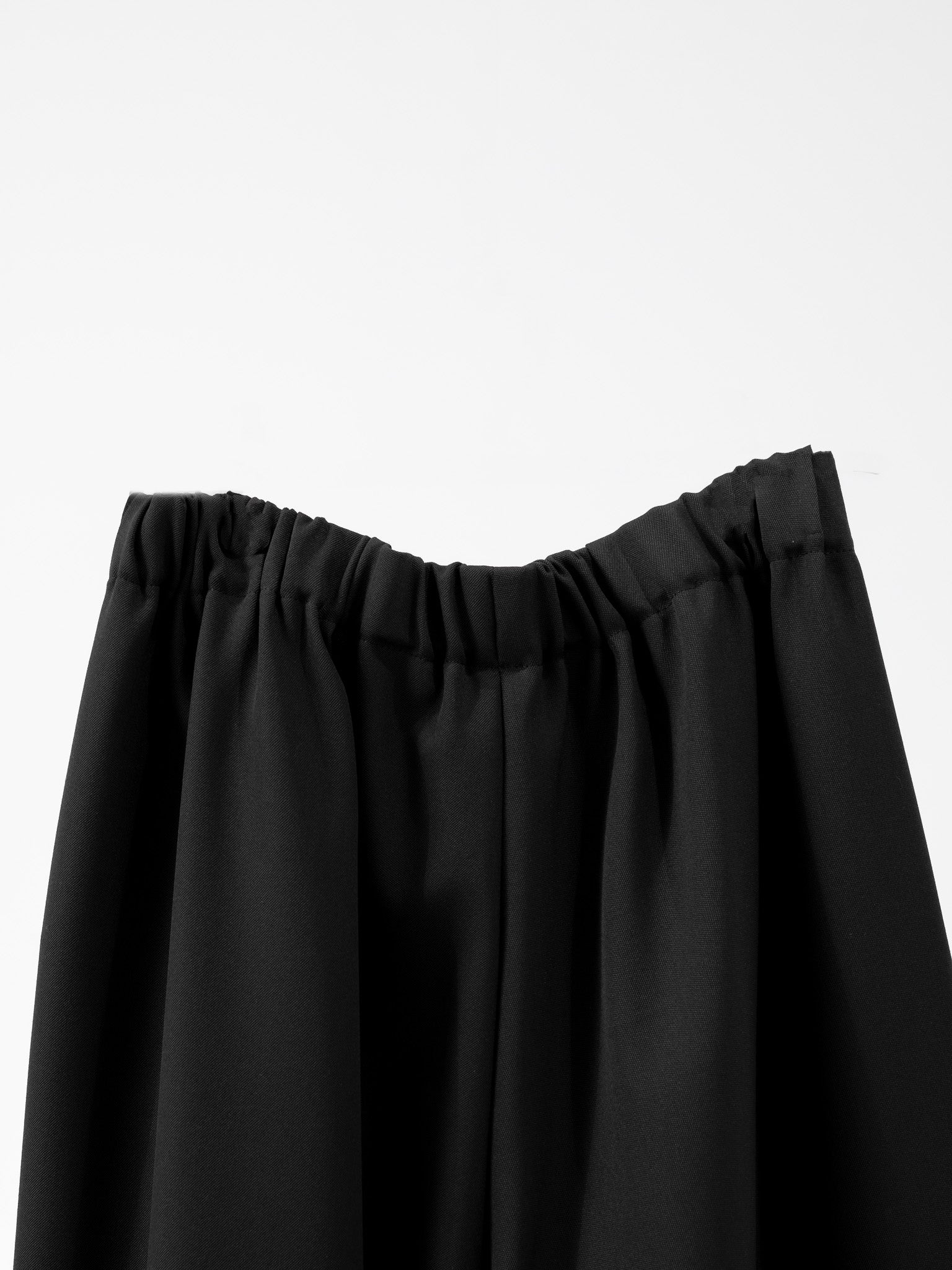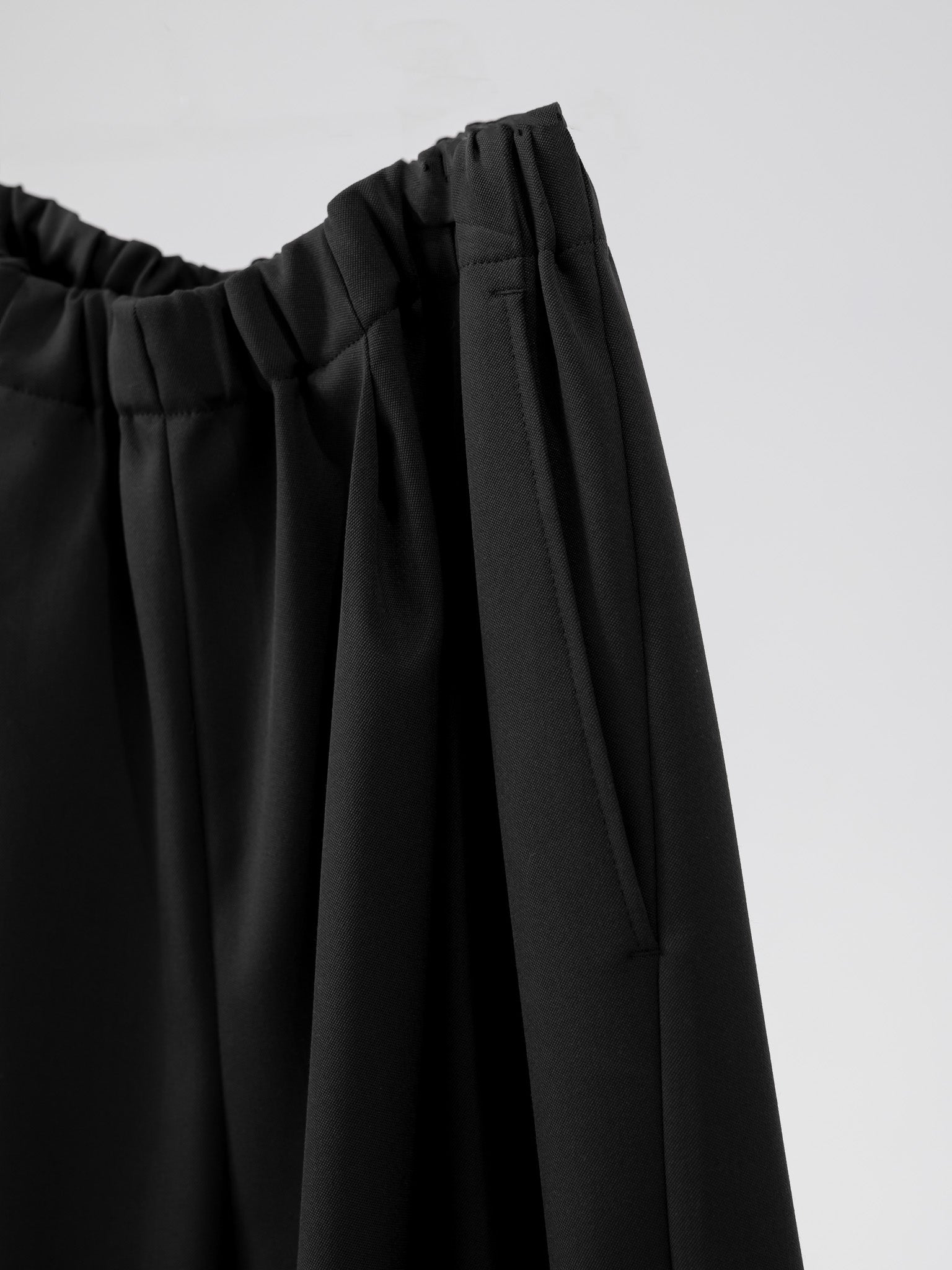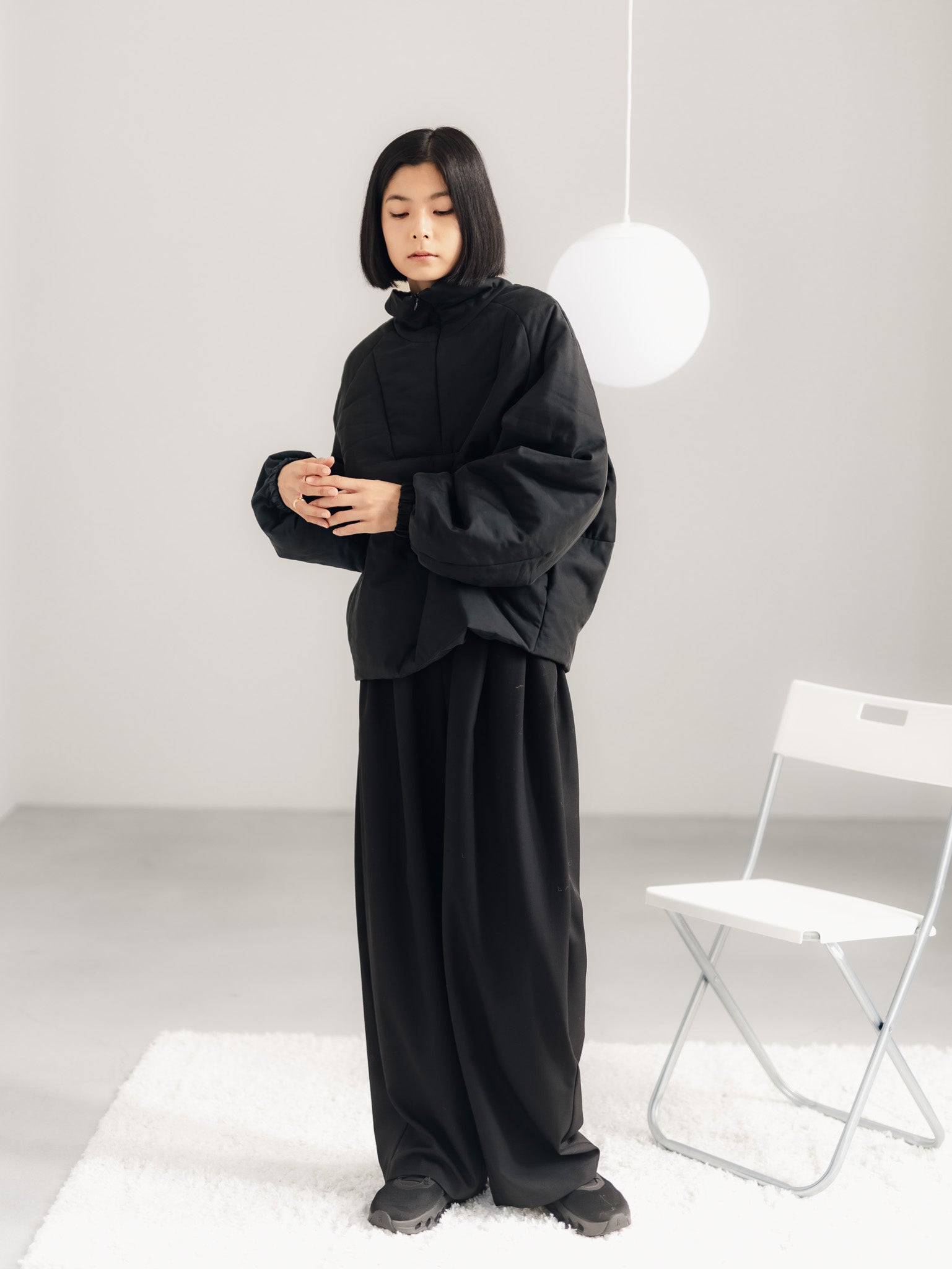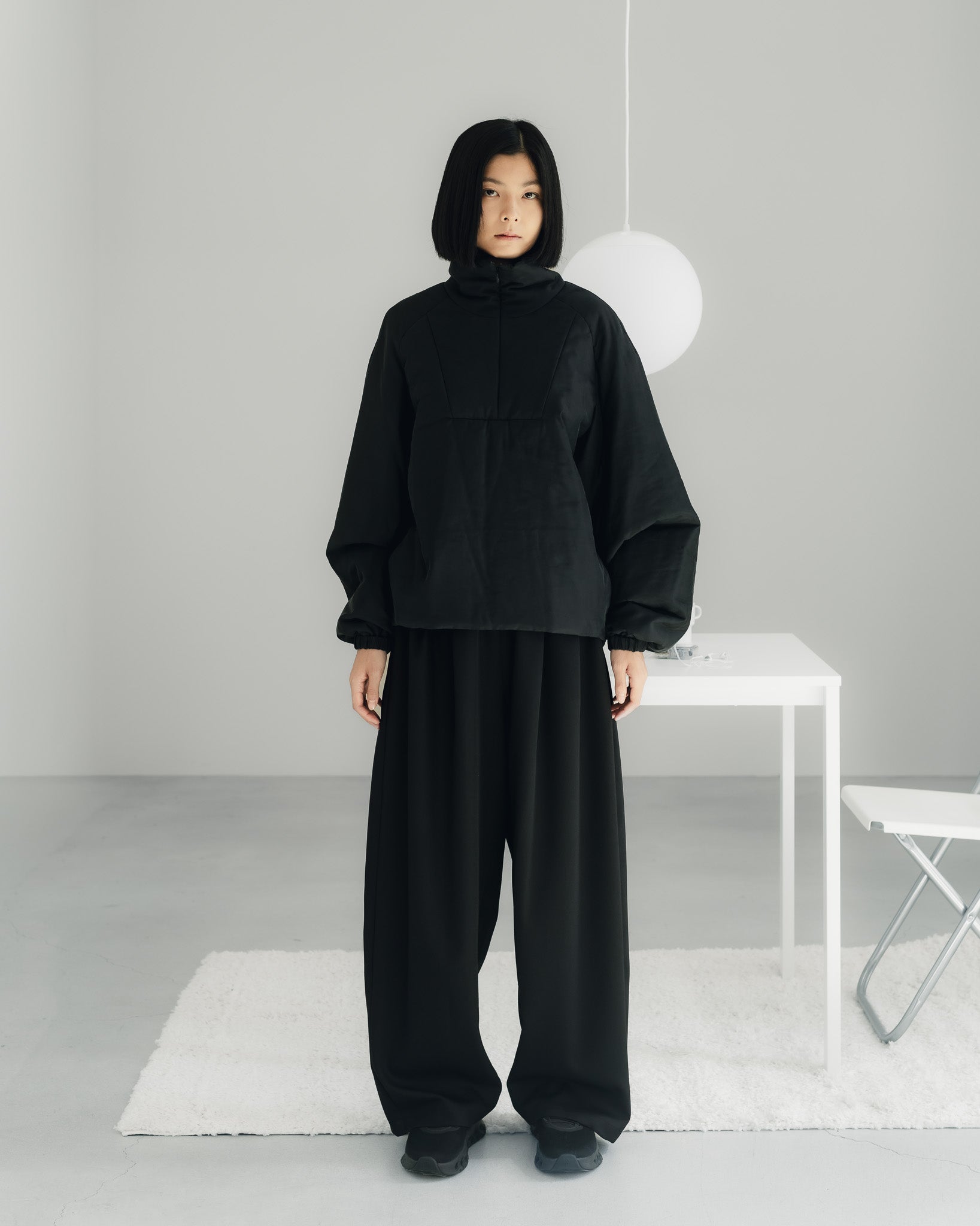 パターンはバレルパンツのような丸みを意識していますが、落ち感のあるウール混素材を使用することで過剰なボリュームを抑え、自然なドレープと縦のラインを強調。